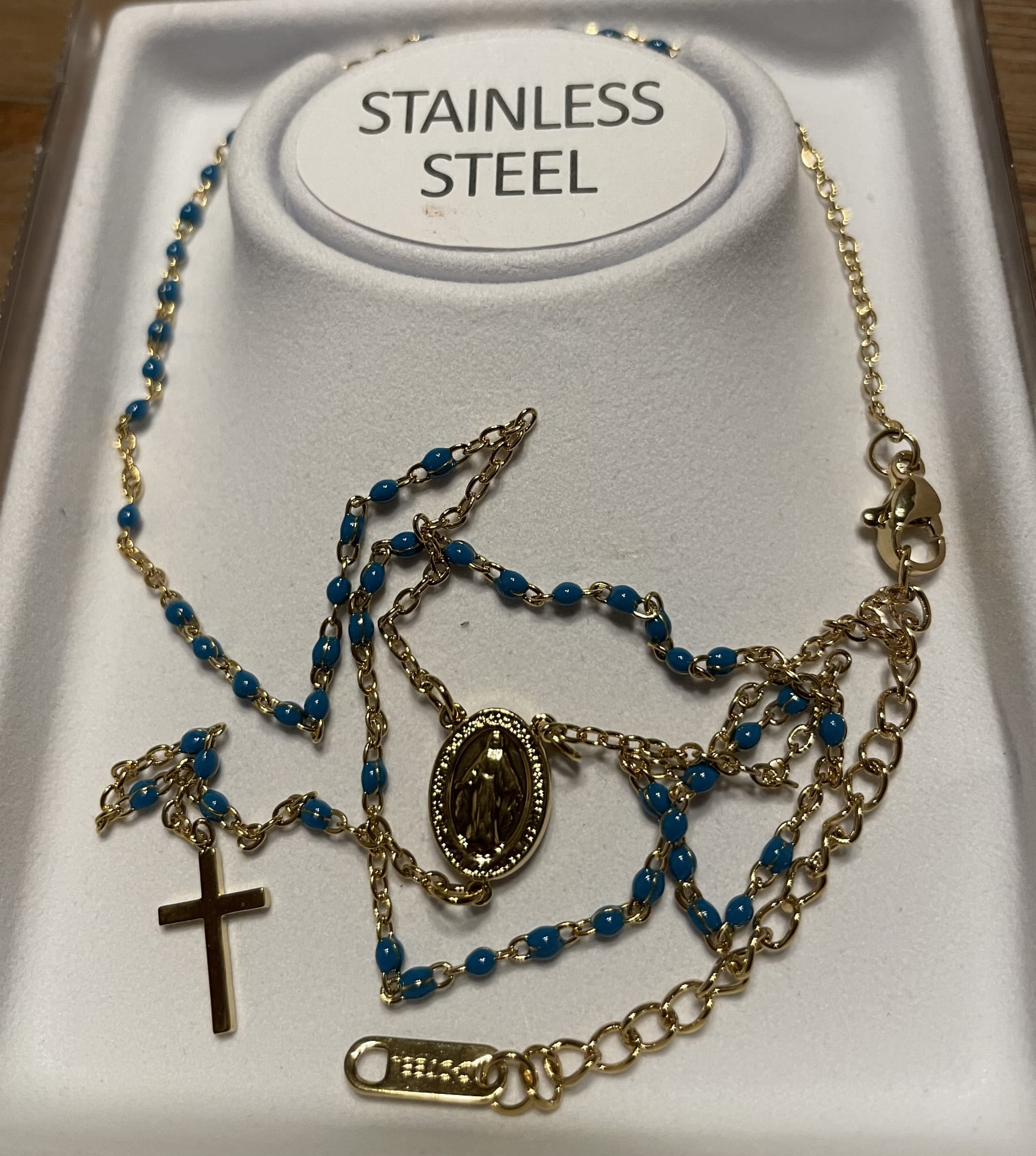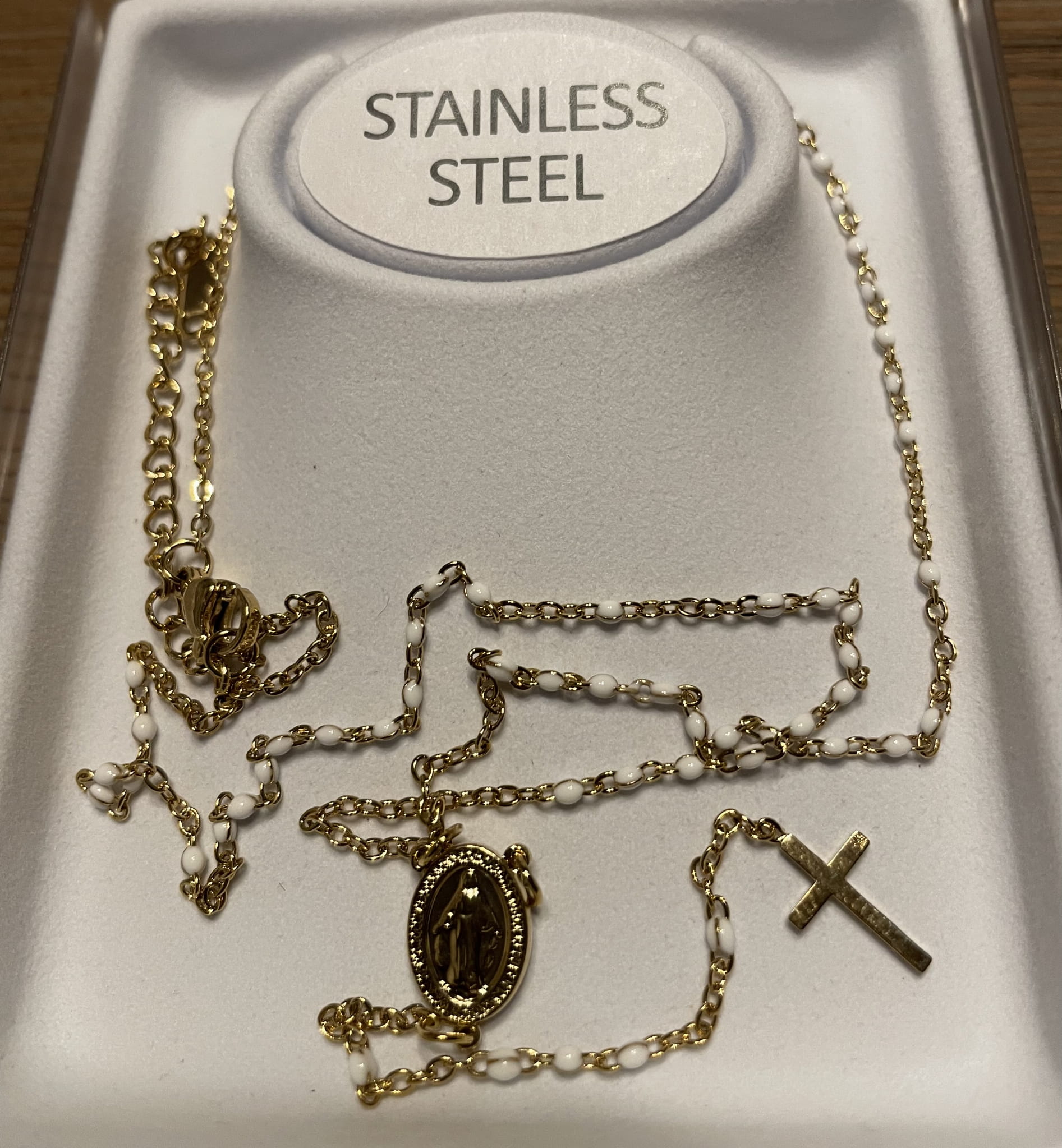 Łańcuszek, cieńsze koraliki, krzyżyk i medalik Niepokalanej z Medjugorie.